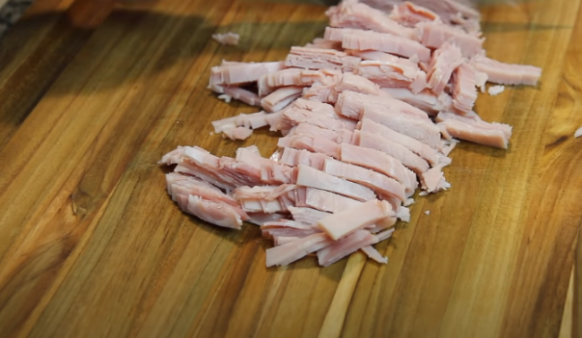 - Ветчину или любую другую колбасу нарезаем небольшими кусочками.