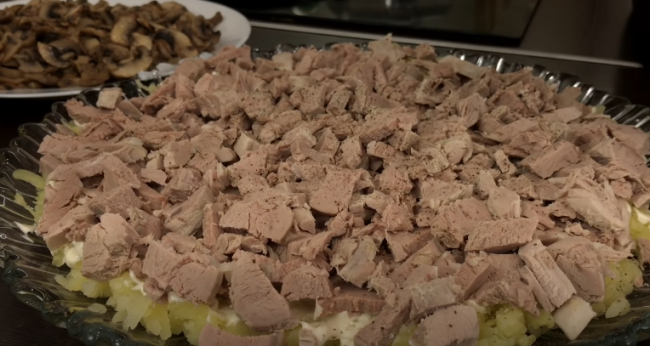 - Следующий слой – мясной. Для этого свиную вырезку предварительно отвариваем в подсоленной воде с добавлением специй, остужаем, нарезаем тонкой соломкой. Мясо перчим и также промазываем соусом.