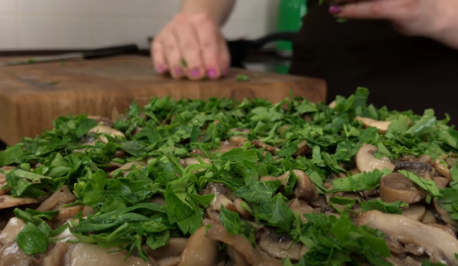 - Теперь делаем слой из жареных грибов, сверху щедро присыпаем измельченной зеленью петрушки.