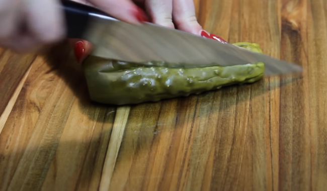 - Следующие слои – маринованный огурец и ветчина, каждый слой смазываем тонким слоем майонеза.