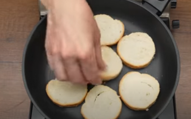 - Отправляем ломтики багета на сухую сковороду и по 1,5 минуты с каждой стороны подсушиваем.