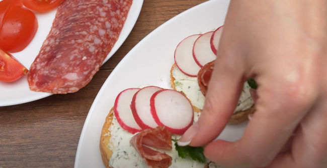 - На основу кладем цветочек из колбасы, 3 кружочка редиса и листик петрушки. Это первый вариант бутербродов.