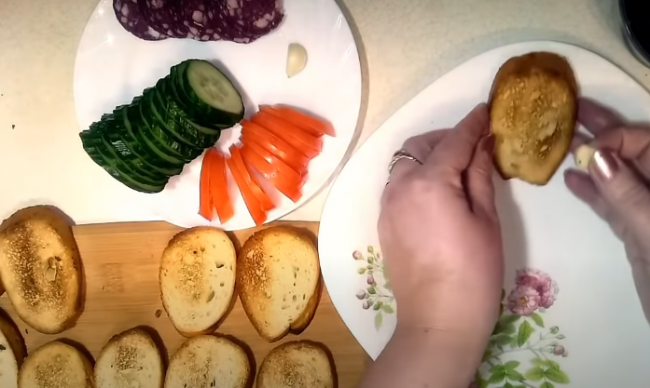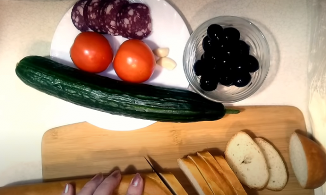 - Для бутербродов подготовим тонкие слайсы колбасы, маслины и зубчик чеснока, которым нужно натереть подсушенные ломтики багета.