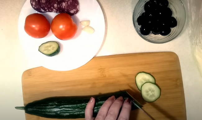 - В это время тонкими кружочками режем огурец, так же, как и багет, немного наискосок. Помидор вначале режем тонкими кружочками, а затем пополам.