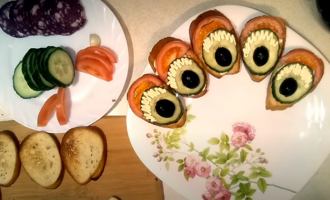 - После делаем ряд из 4 бутербродов с помидором, огурцом и маслиной, не забывая рисовать узор. Последний бутерброд будет с колбасой.