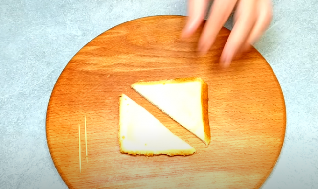 - Берем тостовый хлеб и немного раскатываем его прямо скалкой, после разрезаем на 2 треугольника.