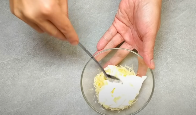 - В миску кладем тертый на мелкой терке сыр, майонез и измельченный любым удобным способом чеснок, все хорошо размешиваем до однородности.