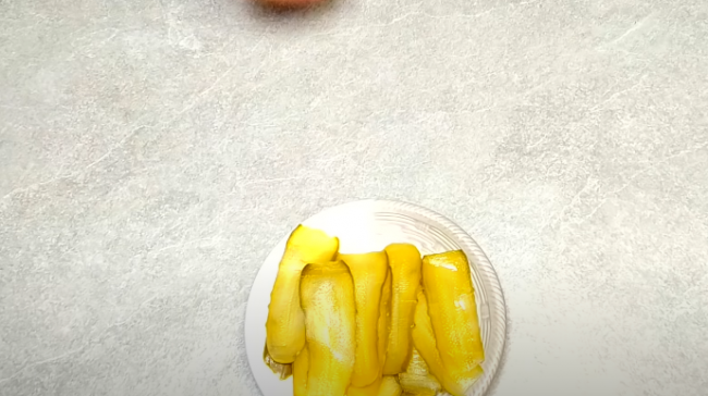 - Маринованный или соленый огурец с помощью овощечистки нарезаем тонкими слайсами.