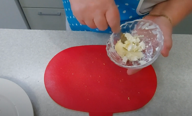 - Для сырной берем творожный сыр, сметану и добавим немного тертого чеснока для пикантности.