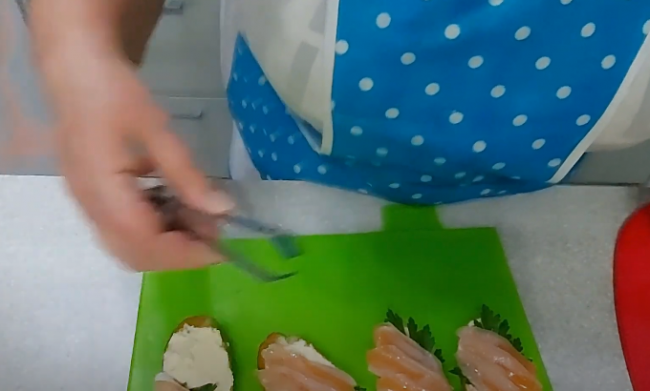 - Берем хлебные заготовки, убираем зубочистки, наполняем их сырной массой, вставляем рыбку, скрученный трубочкой слайс огурца и веточку укропа или петрушки.