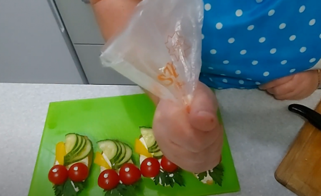- Для овощной закуски берем тонко нарезанные полукружочки свежего огурца, половинки помидоров черри и немного сладкого перца, украшаем закуску капельками майонеза.