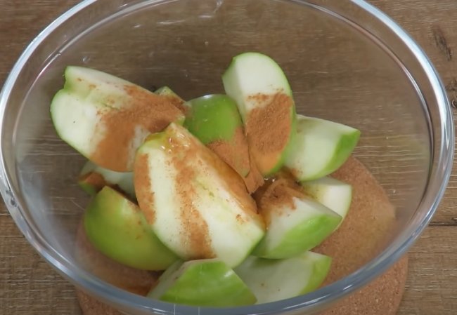 - Оставшиеся яблоки нарезаем дольками, удалив семена, кладем в миску, добавляем немного меда и корицу, хорошо перемешиваем.
