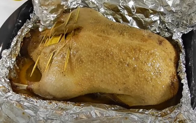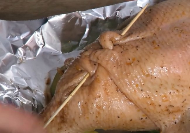 - Закрываем птицу фольгой и запекаем 15 минут при 200 °С и 90 минут при 170 °С.