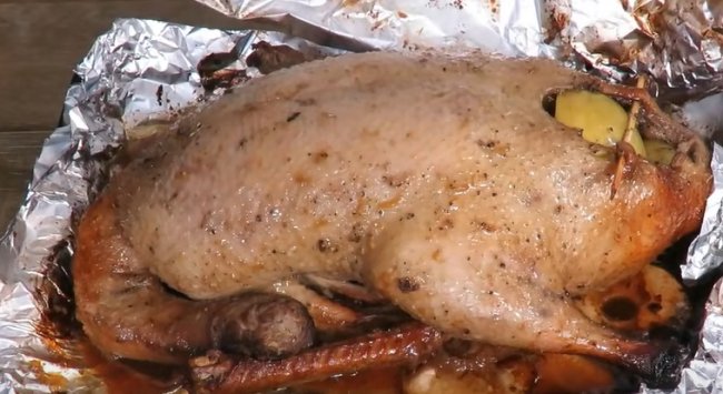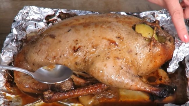 - Достаем птицу. Если ножки подпеклись, закрываем их фольгой, обливаем тушку утиным жиром и запекаем еще 15-20 минут.