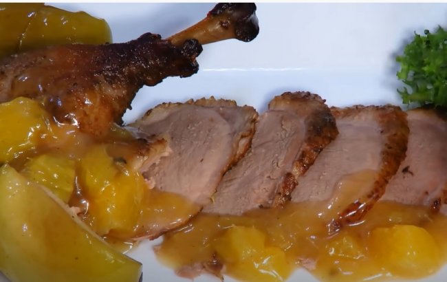 - Запеченную утку прикрываем фольгой и даем ей 15 минут отдохнуть, а затем уже подаем к столу вместе с апельсиновым соусом.