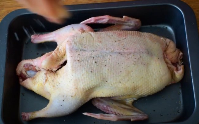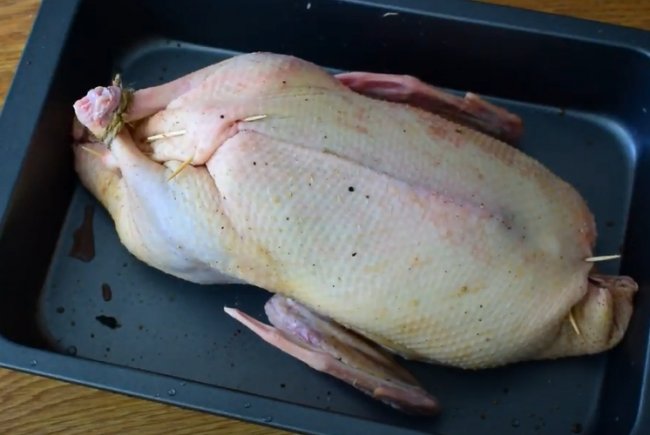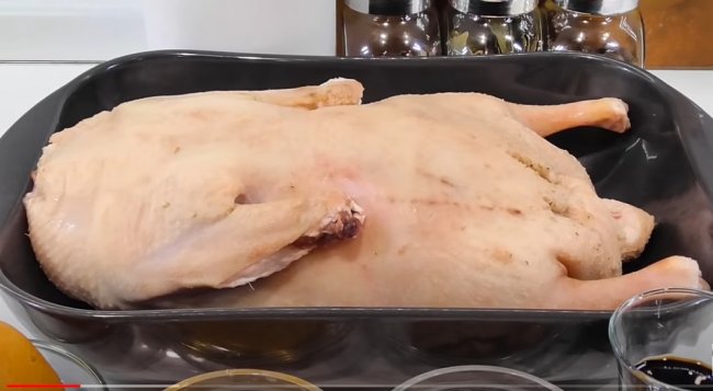 - Кладем утку в глубокую форму, поливаем ее маринадом не только снаружи, но и внутри. Накрыв пленкой, маринуем минимум 12 часов.