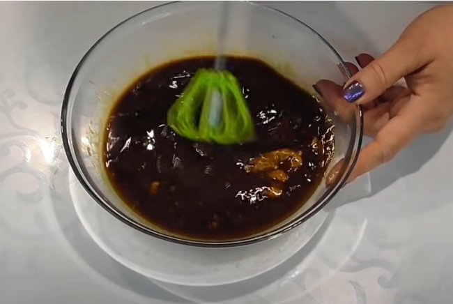 - Сок процеживаем, смешиваем с цедрой, соевым соусом, горчицей и медом, немного солим.