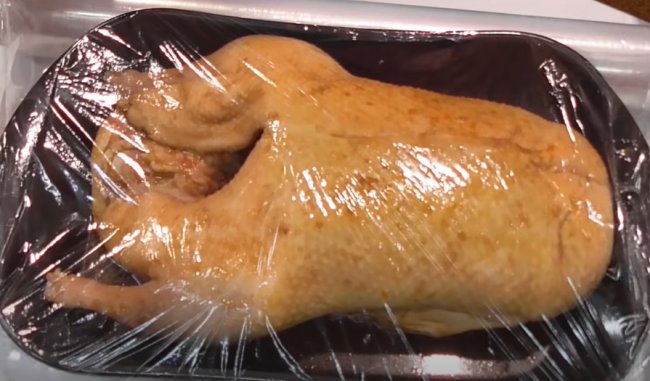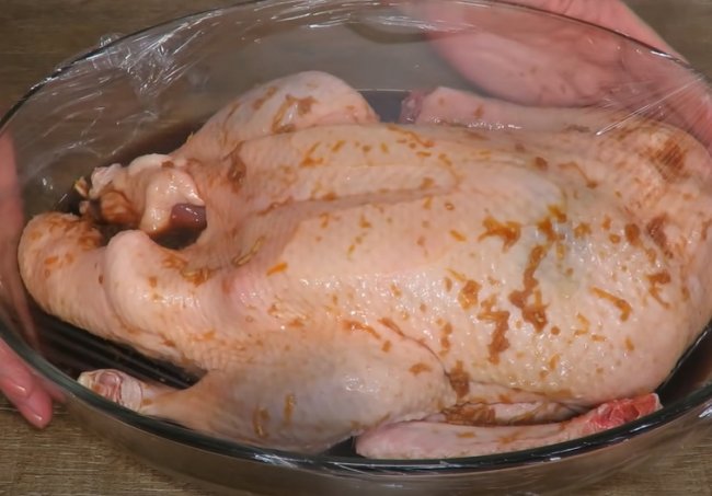 - Маринад вливаем внутрь утки, затем полностью поливаем им тушку, закрываем пленкой и убираем в прохладное место. За то время, пока она будет мариноваться, птицу желательно несколько раз перевернуть.