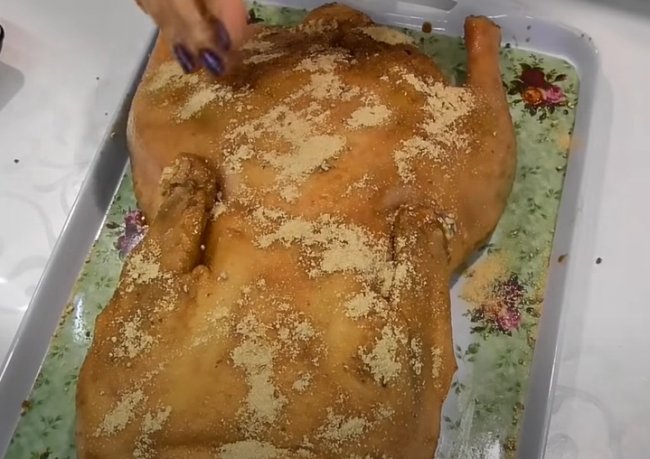 - Обработанную тушку маринуем в смеси соли и молотого перца, оставляем в прохладном месте на 7-8 часов.