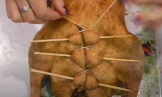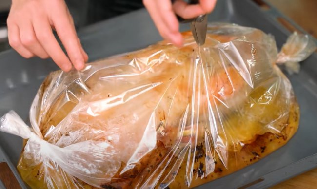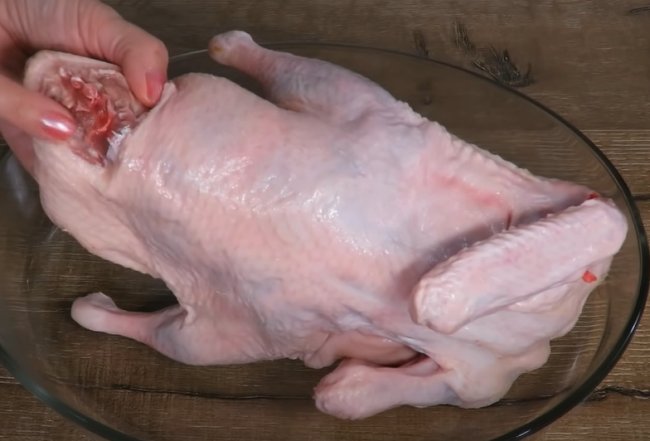- Теперь фаршируем птицу приготовленной начинкой, брюшко зашиваем, укладываем ее в рукав и убираем в прохладное место на всю ночь.