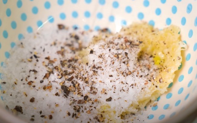 - Любым удобным способом измельчаем зубчики чеснока, добавляем соль и перец, хорошо все вымешиваем.