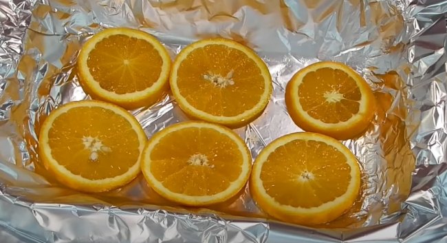 - Форму застилаем пергаментом, но дно кладем апельсиновые кольца, а на них укладываем утку, закрываем фольгой и отправляем в духовку на 1,5 часа (температура 180 °С).