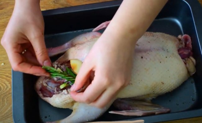 - В брюшко кладем дольки почищенных от семян яблок, крупно порезанные зубчики чеснока и веточку розмарина, зашиваем.