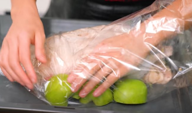 - Чесночной пастой натираем тушку птицы, накрываем пленкой и оставляем мариноваться на 2-3 часа.