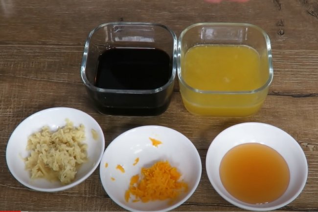- Для маринада с апельсина снимаем цедру, не доходя до белого слоя, свежий корень имбиря измельчаем на терке. Цедру и имбирь вместе с соевым соусом и соком цитруса отправляем в общую миску, тщательно все перемешиваем.