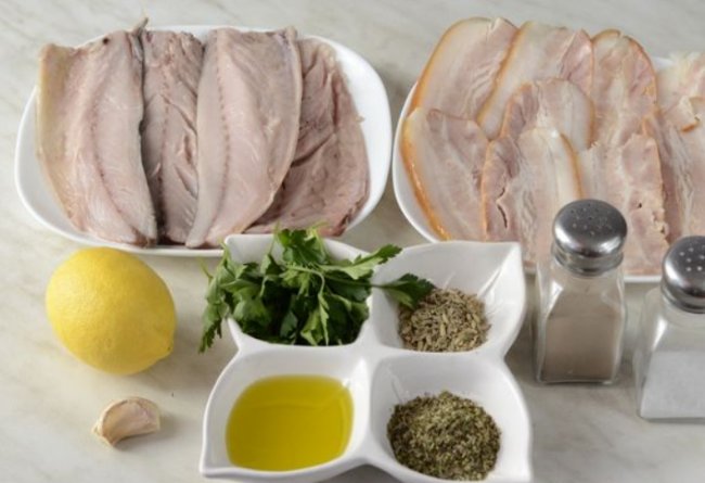 - Свернуть рыбу в рулет (кожа должна быть снаружи). Обернуть каждый из них грудинкой и скрепить при помощи влажной зубочистки.
