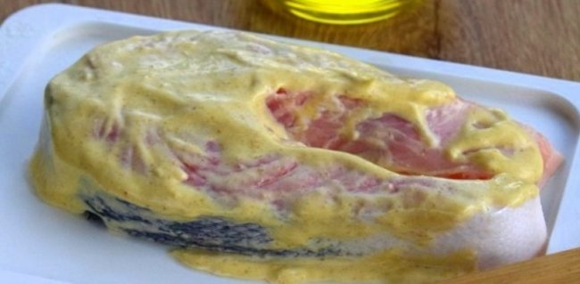 - Перемешать майонез, лимонный сок и оливковое масло. Добавить в заготовку специи по вкусу. Смазать полученной массой верхнюю часть стейка.