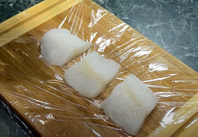 - Филе рыбы порезать порционными кусками. Добавить соли и перца на свое усмотрение.