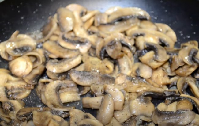 - Порезать грибы и поджарить на растительном масле. Посолить и поперчить на свое усмотрение.