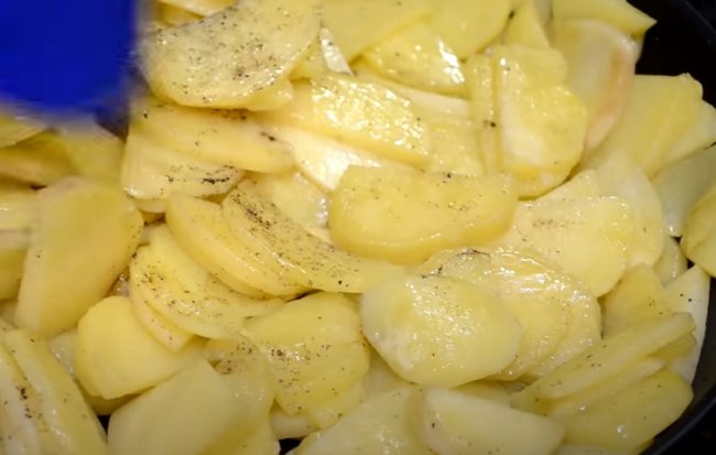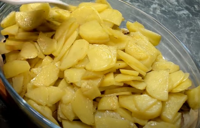 - В подготовленную форму для выпекания положить слой рыбы. Сверху распределить яйца, грибы и картошку.