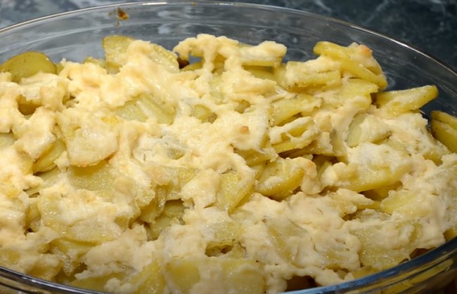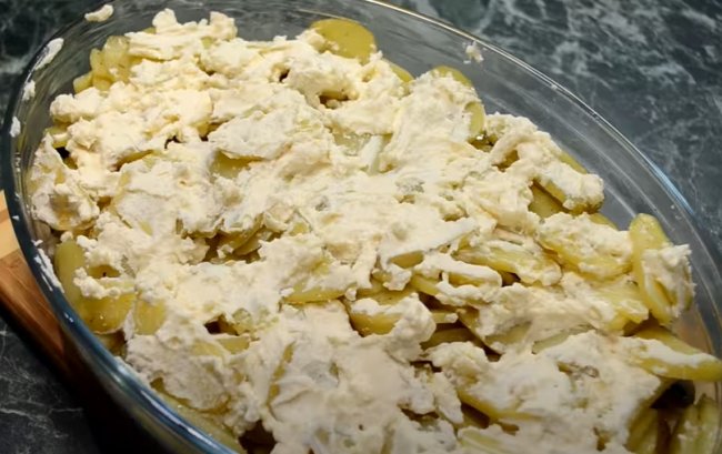Запеченная рыба с картофелем и грибами под сметанным соусом