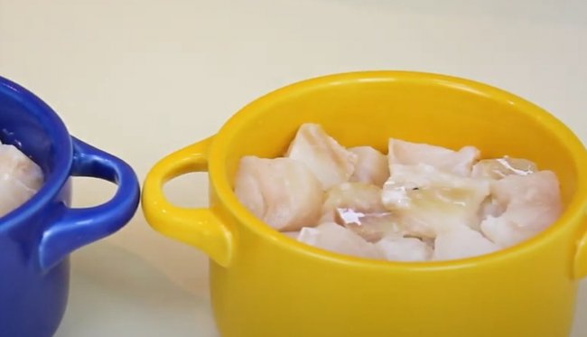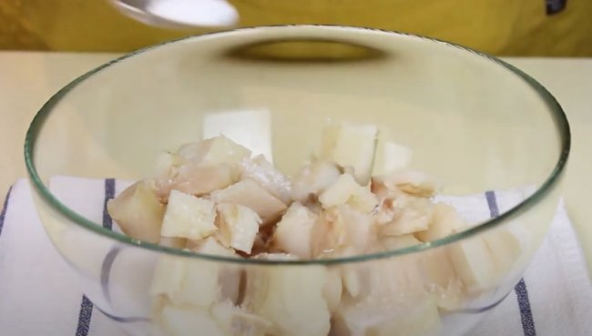 - Промыть филе рыбы, достать косточки и подсушить при помощи бумажного полотенца. Порезать небольшими кусочками. Смешать рыбу с солью и лимонным соком, оставить мариноваться на 10 минут.