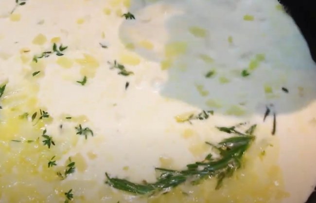 - Влить в заготовку сливки, ввести соль и перец. Потомить все около пяти минут, затем убрать с плиты.