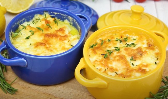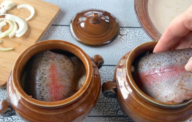 - Сверху добавить рыбу и еще чуть-чуть лука. Закрыть горшочки крышками и отправить в духовку, прогретую до 190 °С. Выпекать 40 минут.