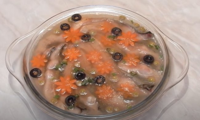 - Аккуратно залить блюдо бульоном. Поставить в холодильник для окончательного застывания.