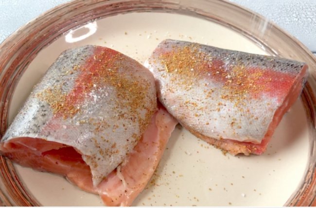- Очистить рыбу от всего лишнего, обязательно убрать голову и хвост. Порезать большими кусками и натереть специями, солью.
