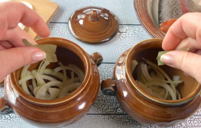 - Выложить в горшочки лук, лавровый лист и горошины перца.