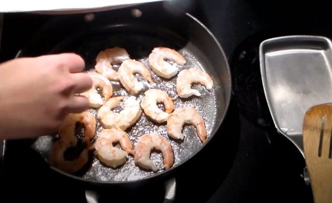 - На сковороде с кипящим сливочным маслом обжариваем креветки по минуте (максимальное время, можно меньше) с каждой стороны, перекладываем в емкость для подачи.