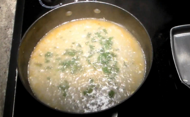 - На сковородку с оставшимся маслом и креветочным соком наливаем лимонный сок с цедрой и белое вино, упариваем до легкого загустения, добавляем измельченную петрушку.