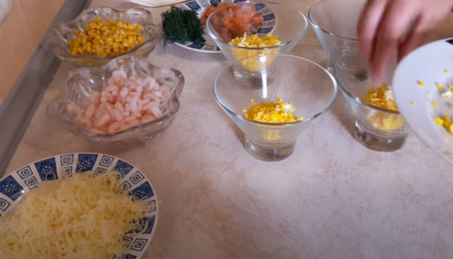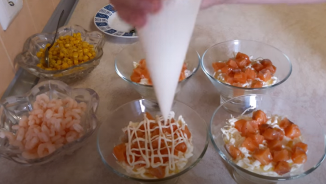 - Для семги и креветок подготавливаем «подушку» в прозрачных креманках. Укладываем ингредиенты двумя поочередными слоями, натираем на крупной терке и наносим на каждый майонезную сетку.