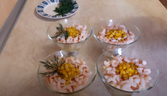 - По всем получившимся окружностям на поверхности салата в порционных емкостях раскладываем креветки, отваренные по паре минут в подсоленной воде.