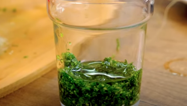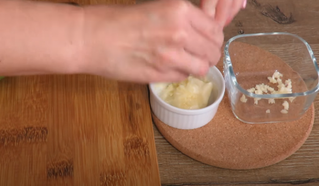 - Начинаем приготовление салата с заправки, чтобы все ее ингредиенты обменялись вкусовыми качествами, для чего измельчаем чеснок и петрушку, добавляем сахар, растираем в кашицу.
