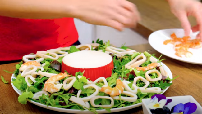 - Очищенные кальмары отвариваем в подсоленной воде минуту, креветки – две (можно использовать уже отваренные), охлаждаем. На блюдо устанавливаем вспомогательную емкость по центру (можно и без нее), вокруг укладываем салатный микс, не уплотняя.