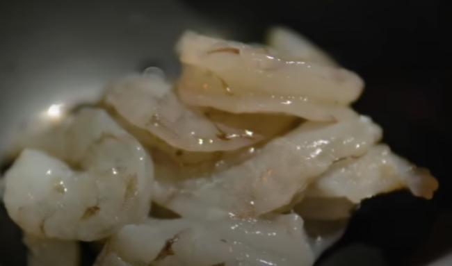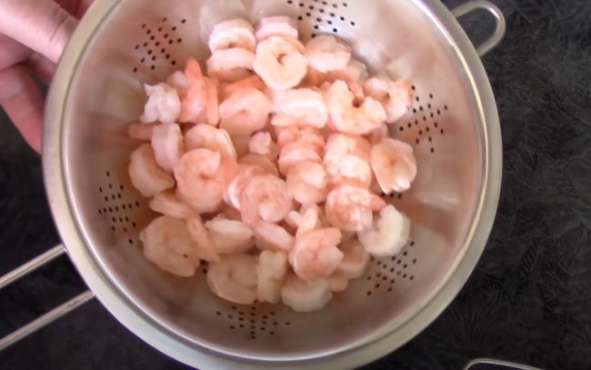 - В дуршлаг, установленный в емкость, выкладываем креветки, поливаем кипятком и оставляем в воде на пару минут, извлекаем, даем воде стечь.
