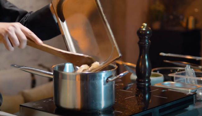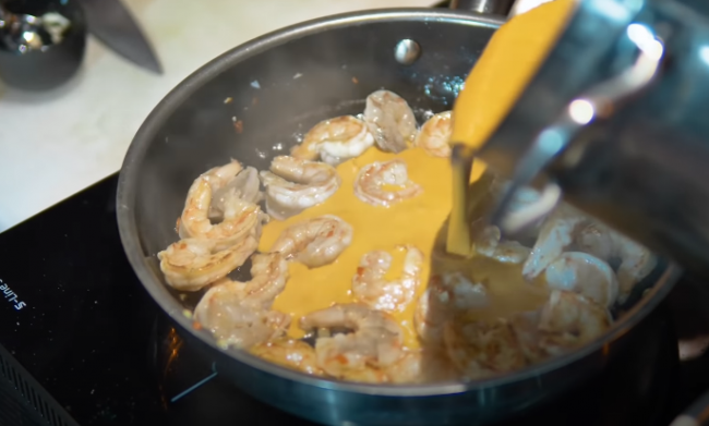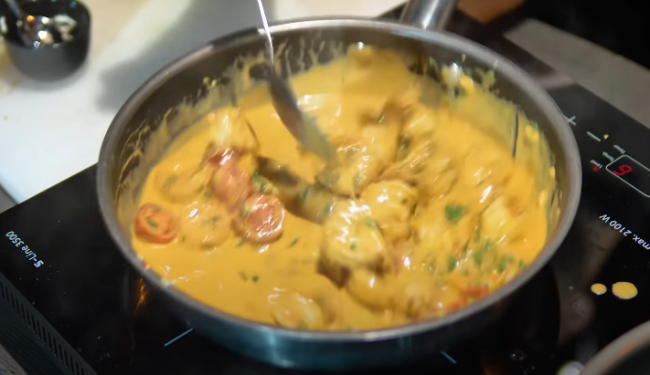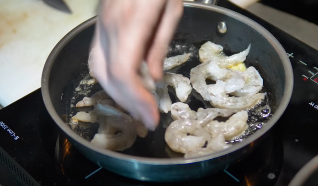 - На разогретой со сливочным маслом сковороде обжариваем креветки в течение минуты, добавляем раздавленный чеснок и перец чили, перемешиваем, вливаем соус, кипятим еще 1 мин.