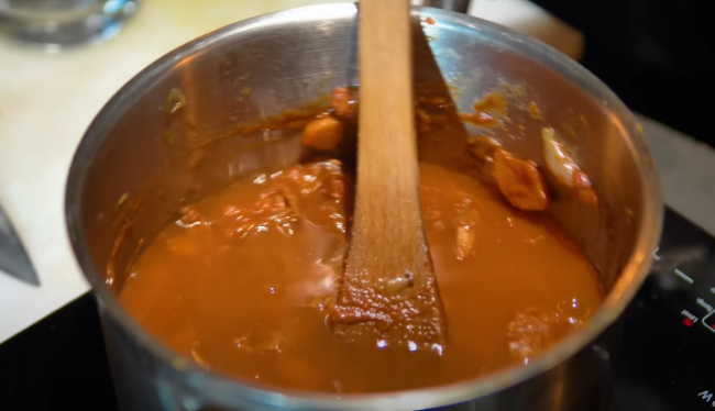 - После того как алкоголь выпарится, наливаем воду (250-300 мл), перемешиваем, тушим без крышки 40 мин., процеживаем.
